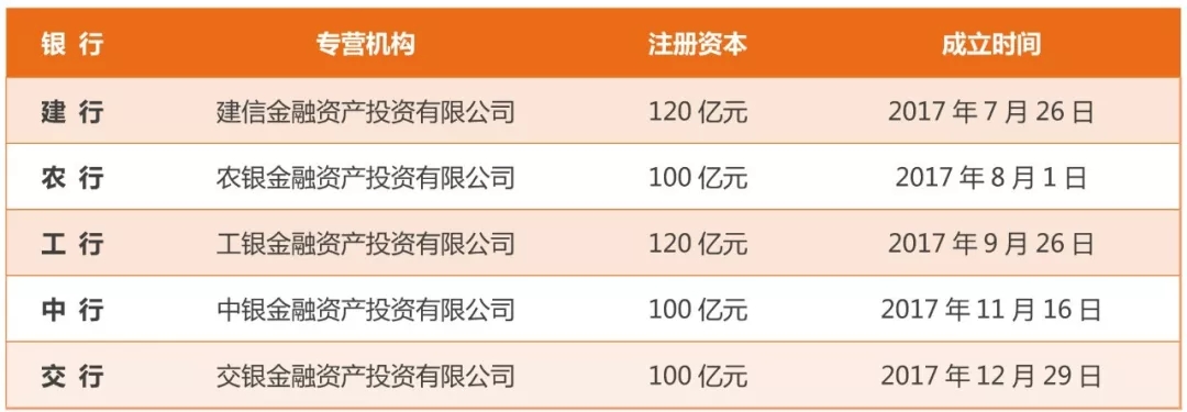 在《指導(dǎo)意見》指導(dǎo)下,2017年8月,首家金融資產(chǎn)投資公司——建設(shè)銀行全資子公司建信金融資產(chǎn)投資公司開業(yè)。目前,我國已成立五家分別由工、農(nóng)、中、交、建五大商業(yè)銀行設(shè)立的金融資產(chǎn)投資公司: