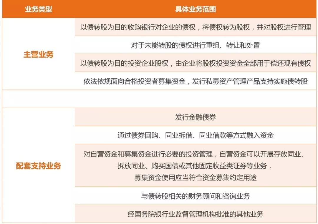 《辦法》第二十三條規(guī)定:經(jīng)國務(wù)院銀行業(yè)監(jiān)督管理機(jī)構(gòu)批準(zhǔn),金融資產(chǎn)投資公司可以經(jīng)營下列部分或者全部業(yè)務(wù):