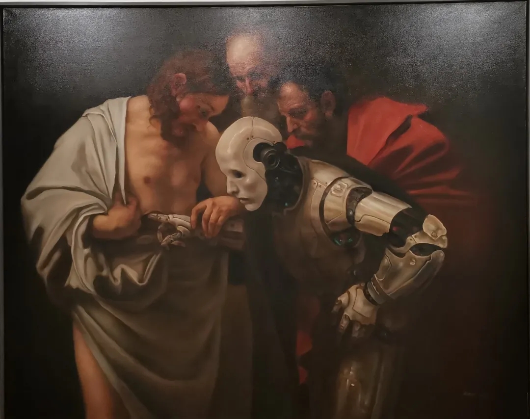圖為龐茂琨作品:《第二次觸摸》,布面油畫,2018年。該作品蘊含著未來智能科技與傳統意識的碰撞,由此促使人們在對未來和傳統之間的理念碰撞以后,會產生出一些新的想法。