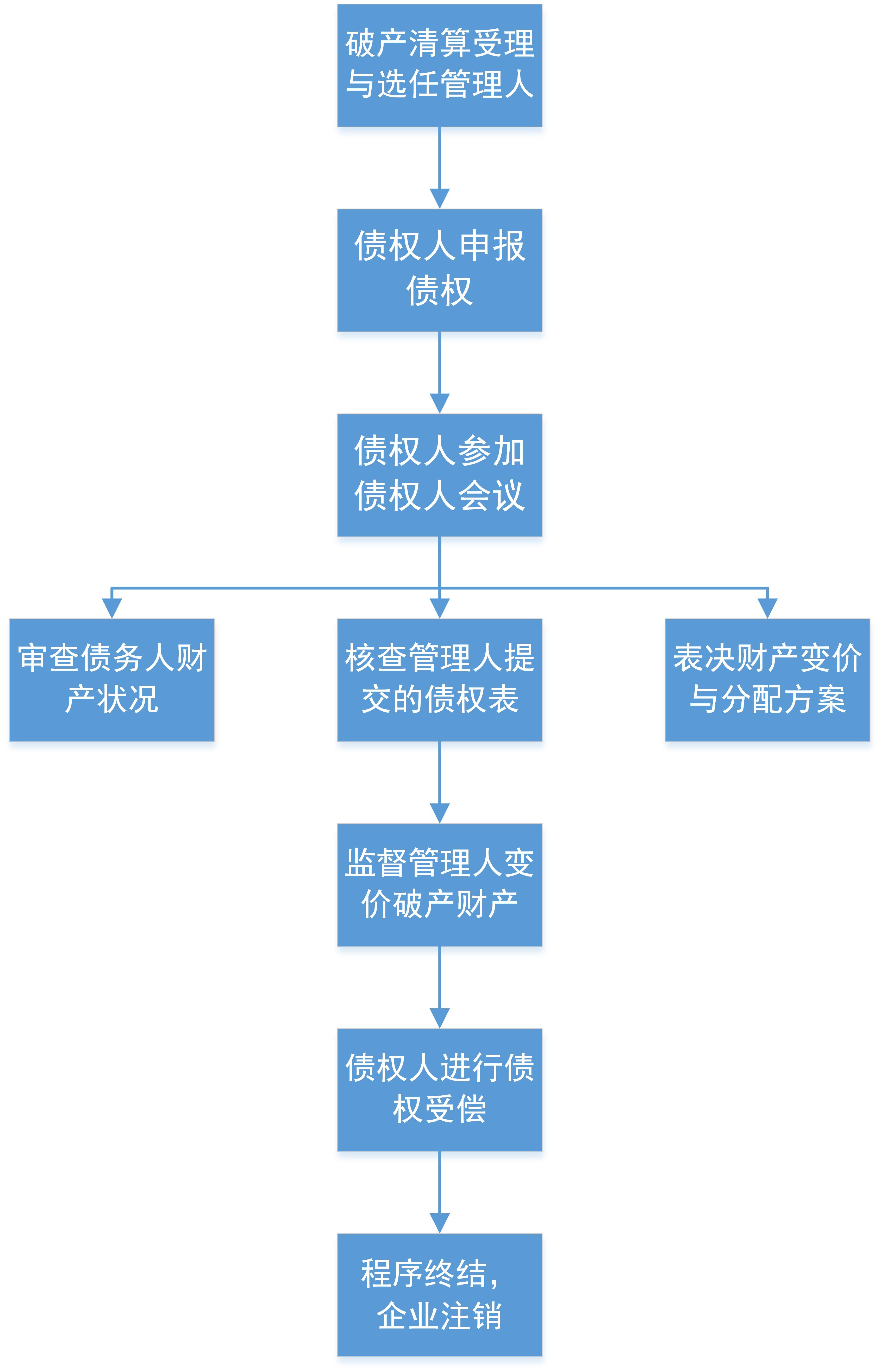 在不考慮轉為重整或者和解程序的特殊情況下,破產清算是對發生破產原因的債務人財產依法進行清理、變價、向債權人分配并最終注銷企業的程序。債權人參與的基本流程如下: