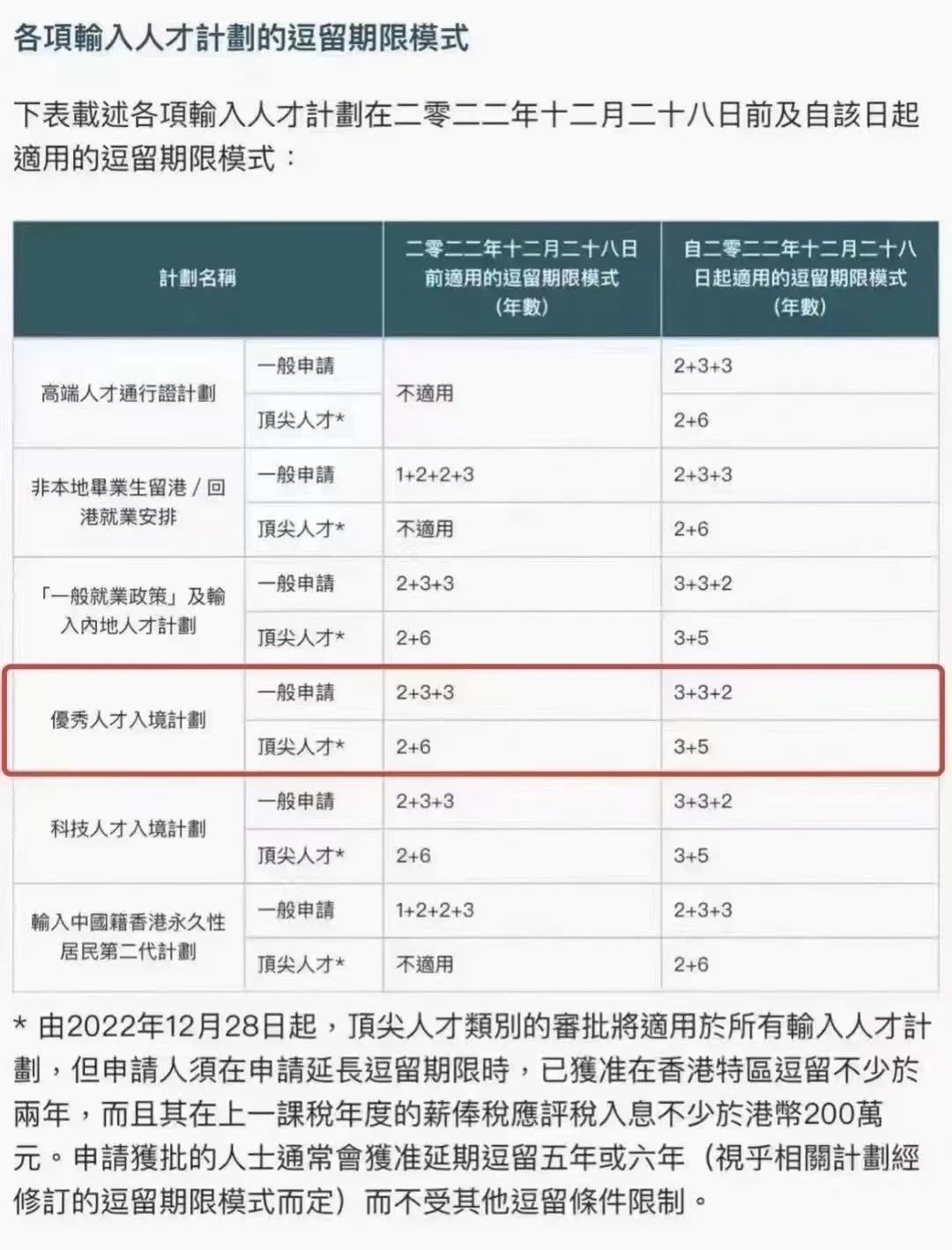 如果是高薪人群,即已獲準在香港逗留不少于2年,而且在上一課稅年度的薪俸稅應評稅入息不少于200萬港幣,一次性可以拿到5年續簽,也就是頂尖人才續簽模式從以前的 “2+6” 變為 “3+5” 續簽模式。