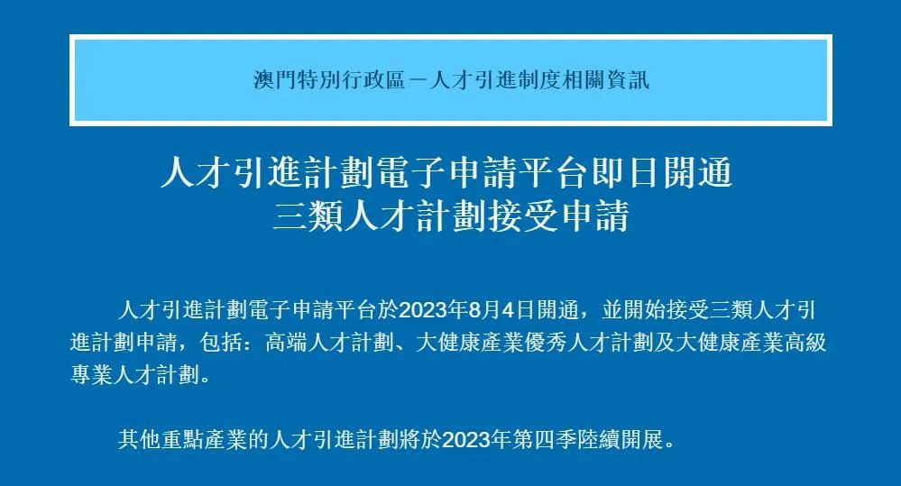 《澳門人才引進法律制度》于7月1日生效,該制度圍繞四大重點產業(大健康、現代金融、高新技術、文化體育)所需,引進高端人才、優秀人才和高級專業人才三類人才,部分人才不論是否在澳門通常居住,均可申請居留許可續期。